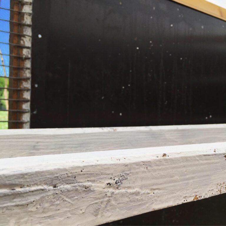 Zie je die witte ‘verf’ op de zitstokken? Dat is de diatomeeënaarde van Pest Free Benelux. Een heel fijn poeder, bestaand uit kiezelwierskeletjes van de eencellige diatomeeën. Het werkt tegen allerlei ongedierte, zonder dat er gif nodig is! Het poeder is zelfs een goede toevoeging aan het kippenvoer